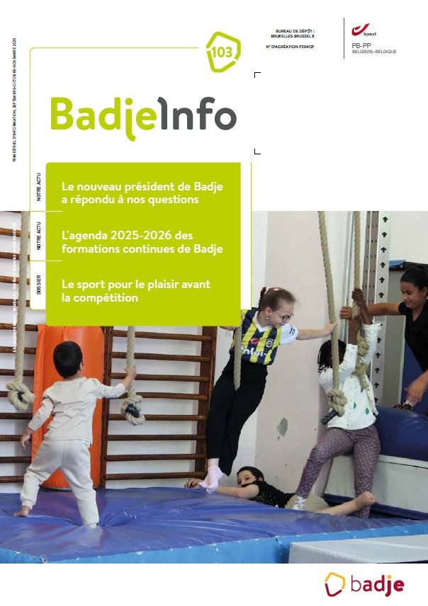 Le sport est au centre du dossier de ce numéro avec un focus sur le loisir et non la compétition. L'actu de Badje est importante et vous retrouverez l'agenda des formations pour le cycle 2025-2026 mais aussi l'interview de notre nouveau président, les 20 ans de notre collègue Dominik et d'autres échos ou annonces d'événements passés ou à venir. Découvrez aussi des nouvelles de nos membres, un bon plan à Villers-la-Ville, sans oublier nos traditionnels bons tuyaux et la rubrique Vivre son métier. Bonne lecture !